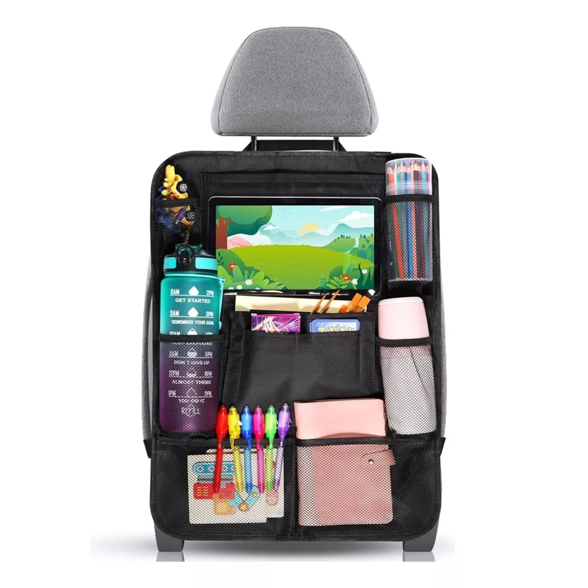 O organizador possui um bolso com suporte que comporta tablet de até 10 polegadas com tela sensível ao toque, mantendo o passageiro do banco de trás entretido durante a viagem. Fácil de instalar e limpar.